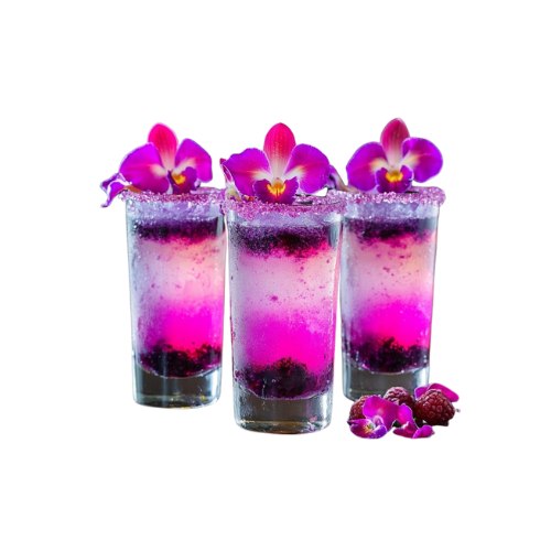 Orchid Blush enchants with its vibrant pink hue and floral elegance. This shot blends luscious berry vodka with a hint of citrus, rimmed in sparkling sugar for a touch of sweetness. Crowned with a fresh orchid petal, it’s a little garden secret, feminine, fresh, and impossibly charming.